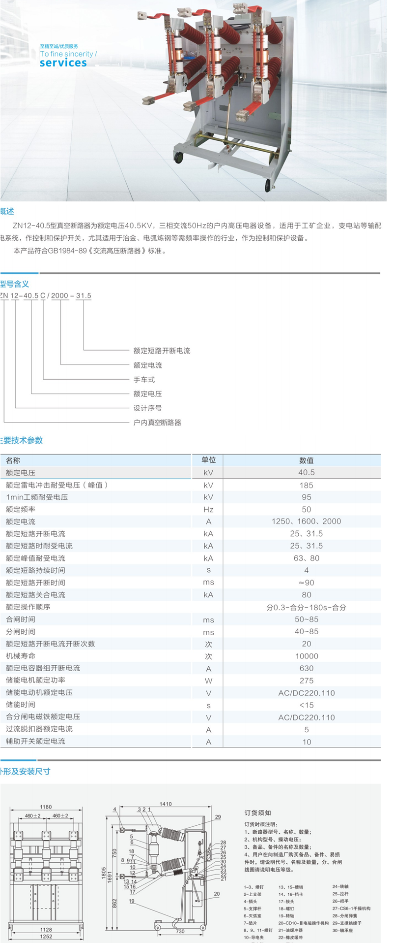 ZN12-40.5型真空斷路器為額定電壓40.5KV,三相交流50Hz的戶內(nèi)高壓電器設(shè)備,適用于工礦企業(yè),變電站等輸配電系統(tǒng),作控制和保護(hù)開(kāi)關(guān),尤其適用于冶金、電弧煉鋼等需頻率操作的行業(yè),作為控制和保護(hù)設(shè)備。